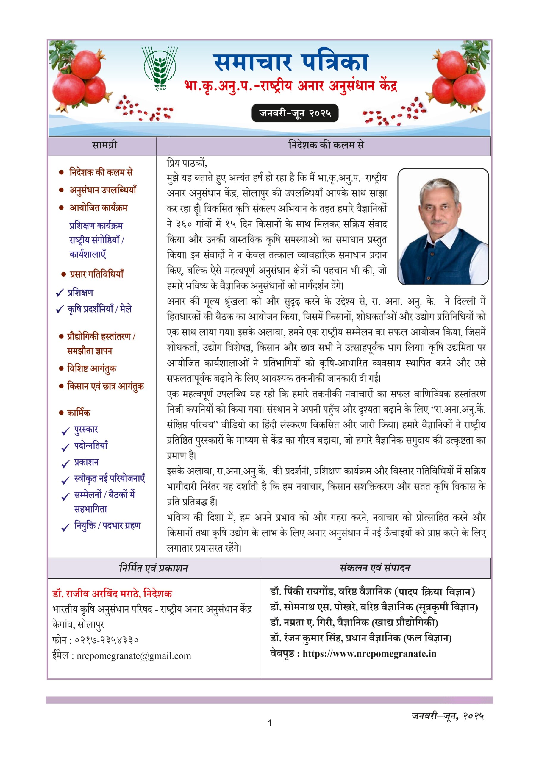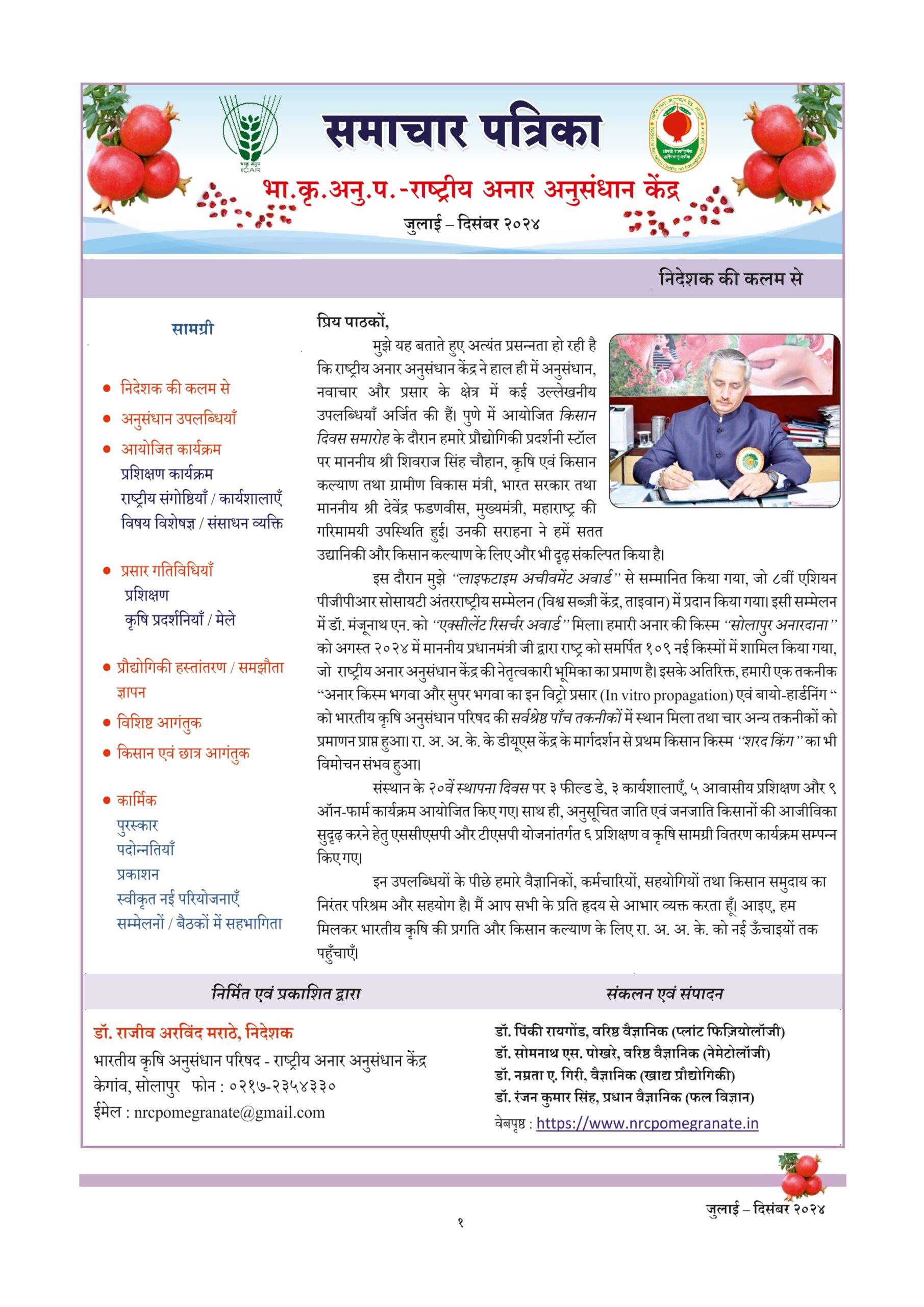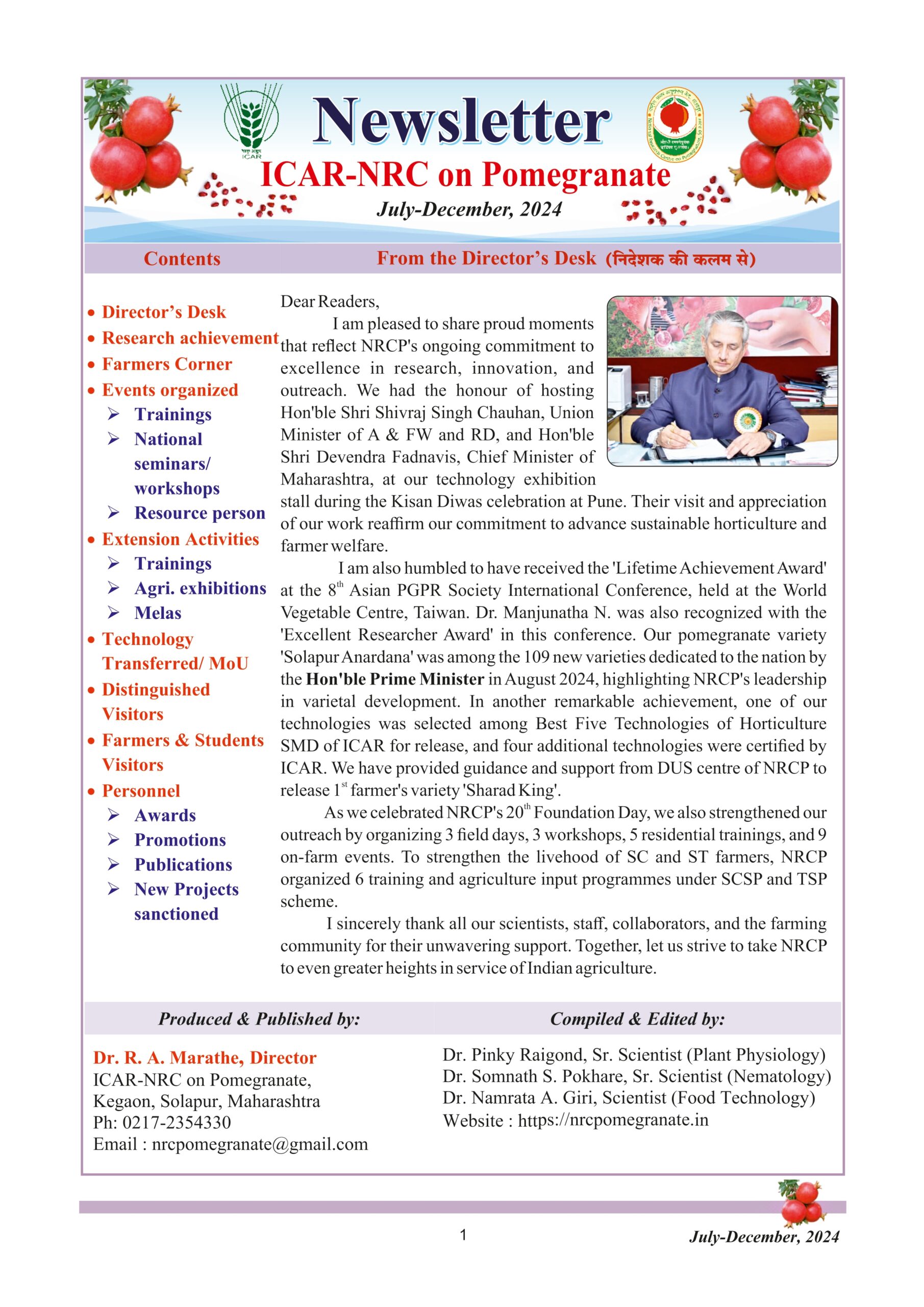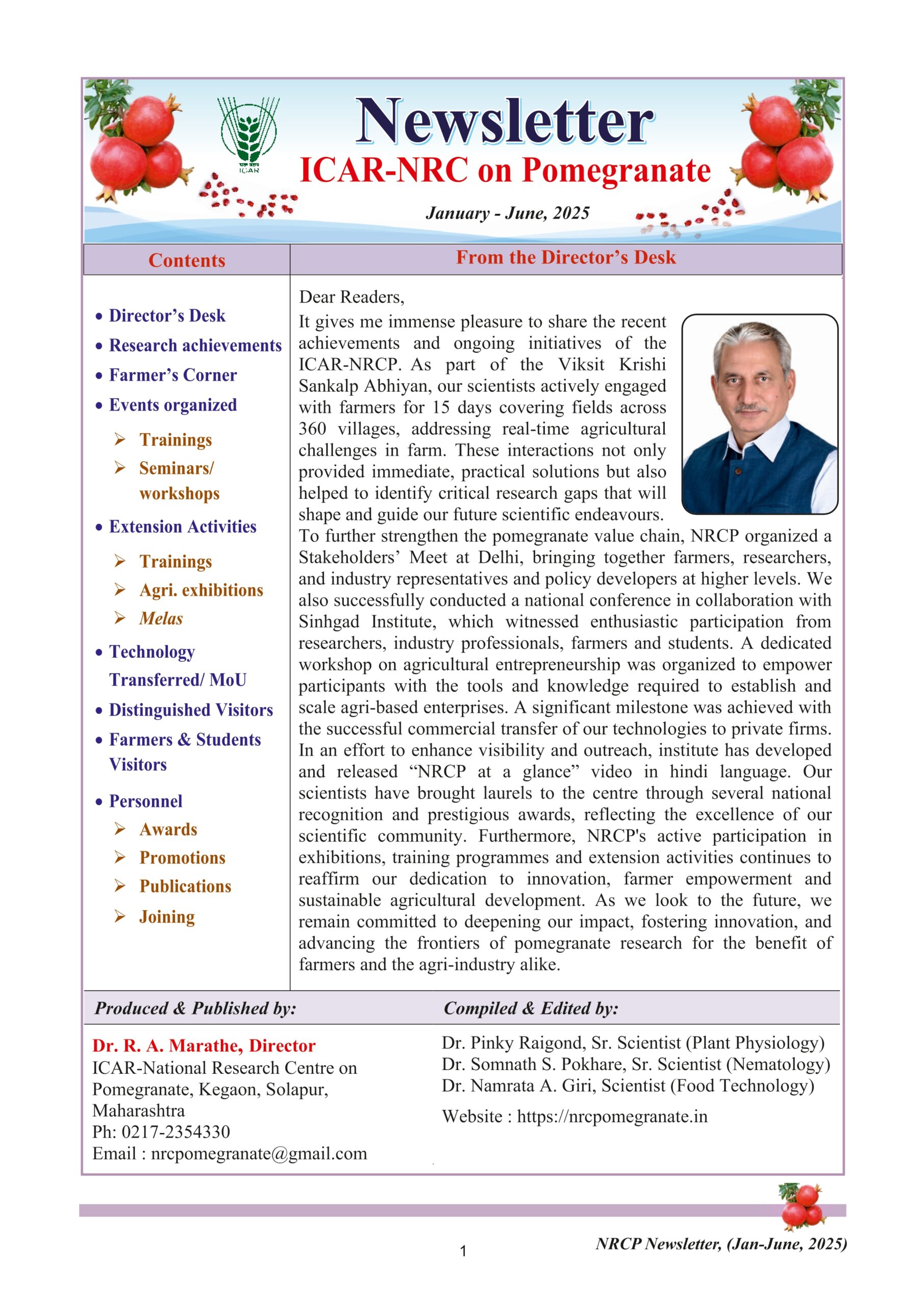 The ICAR-National Research Centre on Pomegranate, Solapur (Maharashtra), was established on June 16, 2005 by the Indian Council of Agricultural Research, New Delhi, as a step to strengthen research and development in pomegranate. This is the only institute working solely on pomegranate. The centre was established to fulfill the growing demand for pomegranate both in domestic and export market by tapping the immense production potential prevailing in the country.